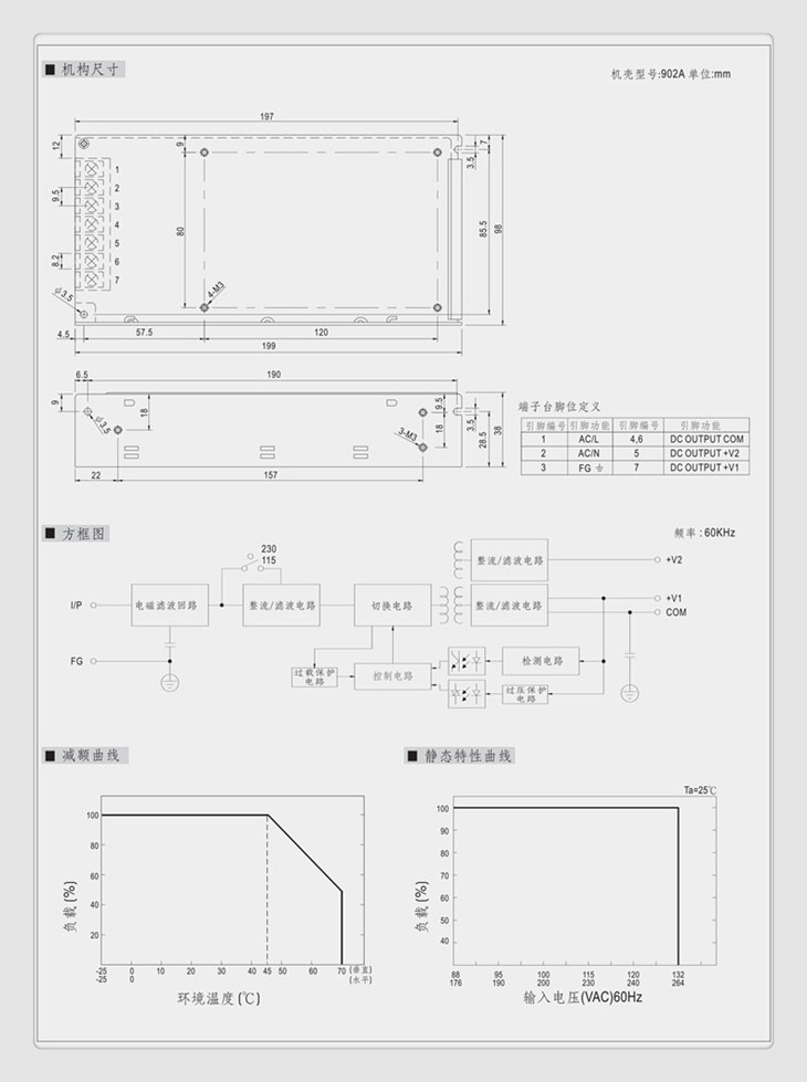 输入电压范围 由开关选择88~132VAC/180~264VAC (或248~373VDC (承受5秒钟300VAC高压输入不损坏)