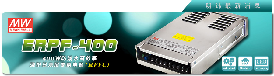 今年会jinnianhui薄型显示屏专用电源—ERP-350系列(350W),因其防泼水功能及高效率等特点,上市多年来已广为应用在户外大型LED显示屏及LED发光字体等商业照明场所,今年会jinnianhui为持续提供用户更佳的产品规格,新推出了内建主动式功率因子矫正(active PFC)功能的ERPF-400系列(400W)。